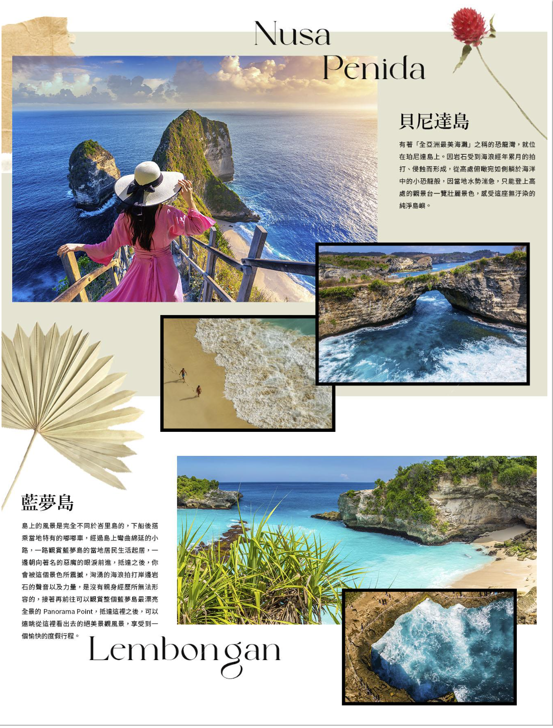 【藍夢島】島上的風景是完全不同於峇里島的,下船後搭乘當地特有的嘟嘟車,經過島上彎曲綿延的小路,一路觀賞藍夢島的當地居民生活起居,一邊朝向著名的惡魔的眼淚前進,抵達之後,你會被這個景色所震撼,洶湧的海浪拍打岸邊岩石的聲音以及力量,是沒有親身經歷所無法形容的,接著再前往可以觀賞整個藍夢島最漂亮全景的Panorama Point,抵達這裡之後,可以遠眺從這裡看出去的絕美景觀風景,享受到一個愉快的度假行程。