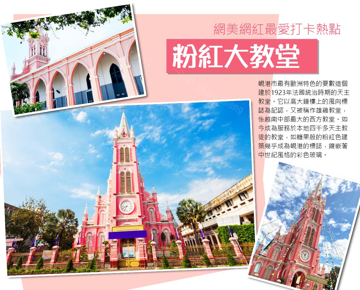 法國殖民時期歌德式建築的天主教堂,建於1923年,整座教堂的外牆以粉紅色為主,為越南中部最大的西方教堂,是法國殖民時期的建築作品,因塔頂上有個公雞的風向標誌,當地人又稱公雞教堂。在藍天白雲之下,陽光撒落在粉紅教堂上如糖果般的繽紛。