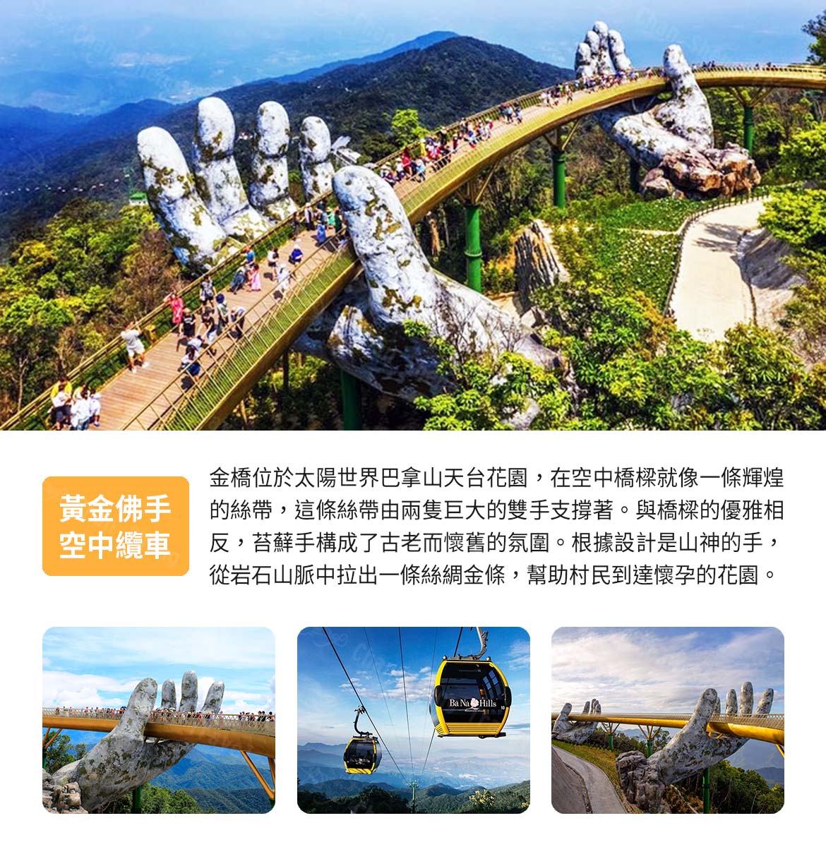 巴拿山上有一座特別的金色橋樑,從遠處乍看宛若峴港上空雲層裡的一條絲帶。撐起「黃金橋」的巨大雙手布滿青苔,風化效果營造出歲月和蒼桑的美學之感。巨手托捧著金色橋身,聳立海拔約1400公尺的雲霧之上,更帶有一點禪意,天氣晴朗時,視野一望無際,當大霧時,橋就像浮在雲海之中,另有一番淒美意境。
