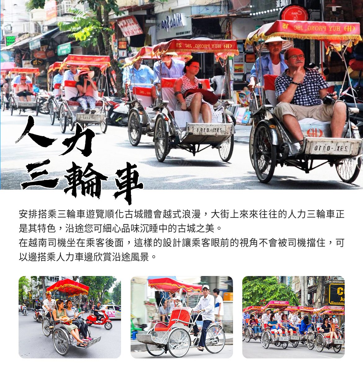 安排搭乘三輪車遊覽順化京城體會越式浪漫風情,這裡觀光三輪車也頗具順化特色,沿途您可細心品味沉睡中的古城之美。