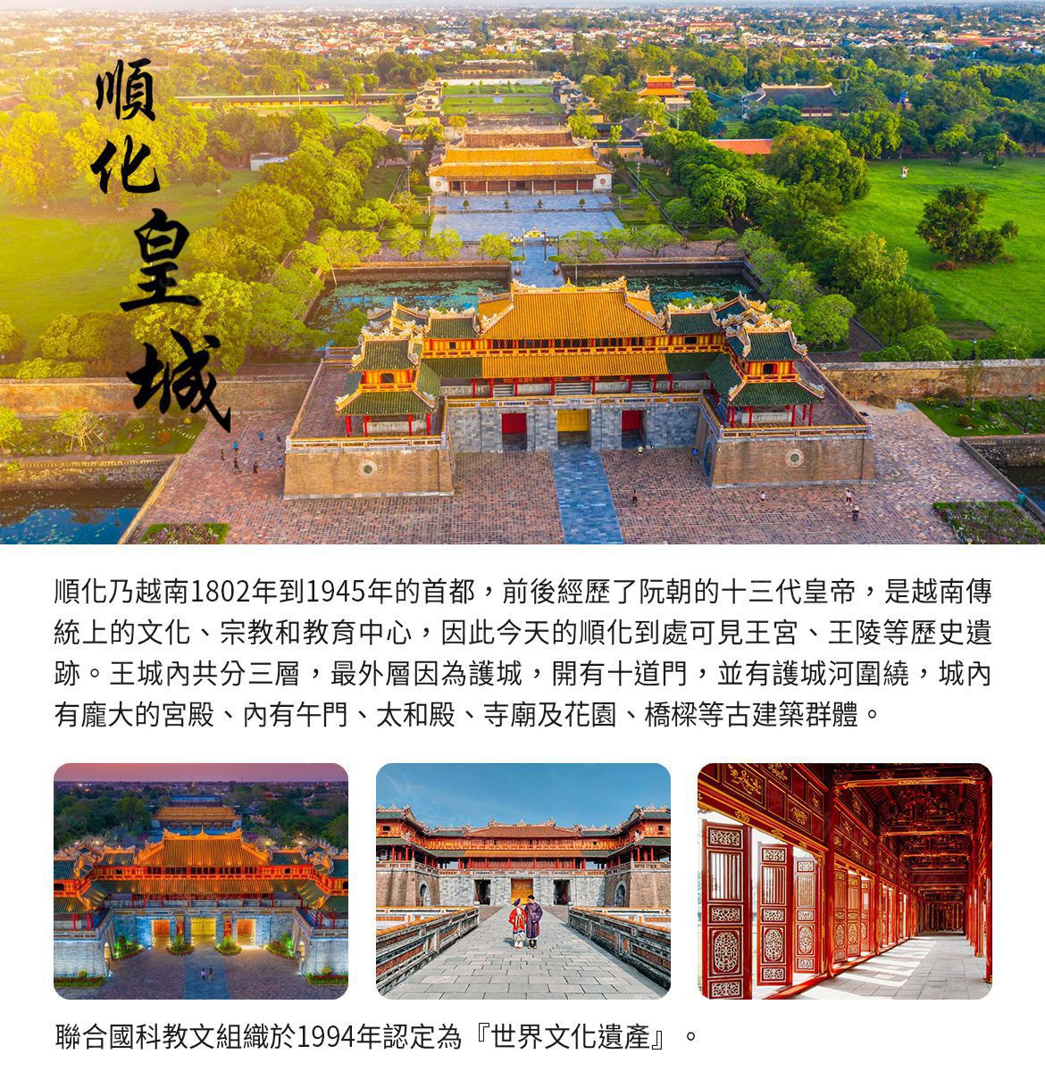 順化乃越南1802年到1945年的首都,前後經歷了阮朝的十三代皇帝,是越南傳統上的文化、宗教和教育中心,來到順化一定要參觀【順化皇城】,從19世紀開始,順化就為越南阮王朝的首都,因此今天的順化到處可見王宮、王陵等歷史遺跡。【紫禁城】(The Citadel and Imperial City)越南阮朝十三代皇宮,王城內共分三層,最外層因為護城,寬21公尺高7公尺,周長共有10公里,開有十道門,並有護城河圍繞,城內有龐大的宮殿、內有午門、太和殿、寺廟及花園、橋樑等古建築群體。阮朝開國君王於1804年始建,費時30年完工,為1802年至1945年阮朝之皇都,此地就像中國的北京紫禁城有異曲同工之妙。聯合國科教文組織於1994年認定紫禁城為『世界文化遺產』,肯定其觀光價值,此處所有古蹟上的題字都是我們所熟悉的中國文字,可見昔時順化受中國殖民之深厚影響。