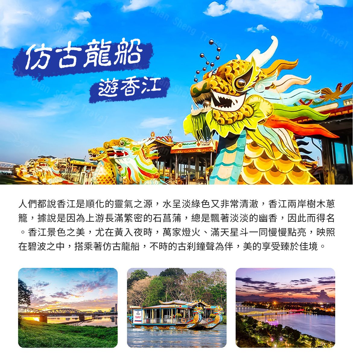 人們都說香江是順化的靈氣之源,水呈淡綠色而且又非常清澈,香江兩岸樹木蔥籠,據說是因為上游長滿繁密的石菖蒲,清澄的河水中,總是飄著淡淡的幽香,香江之所以得名。蜿蜒清澈穿過古城,將古城分成南北,也塑造出不少風景雅致的角落。江岸兩側全為綠草覆蓋,藍天、白雲、青山、綠水,人在此彷彿置身於畫中。香江景色之美,尤在黃昏入夜時,萬家燈火、滿天星斗一同慢慢點亮,映照在碧波之中,搭乘著仿古龍船,不時的古刹鐘聲為伴,美的享受臻於佳境,曾吸引騷人墨客流連忘返,也不知使多少遊人為之陶醉和讚美。