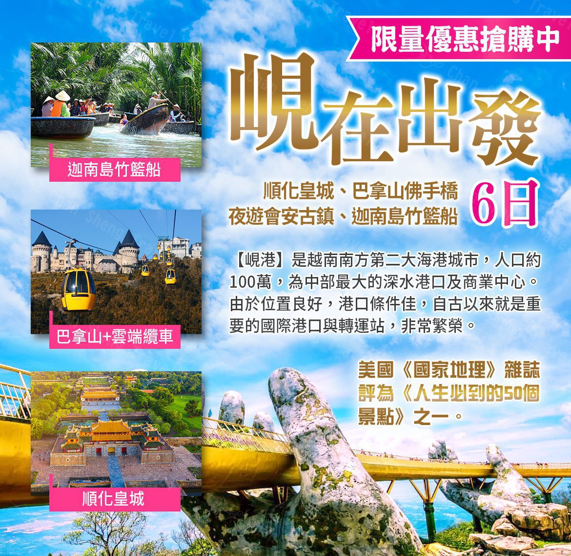峴在出發~順化皇城、巴拿山佛手橋、夜遊會安古鎮、迦南島竹籃船6日(越捷)