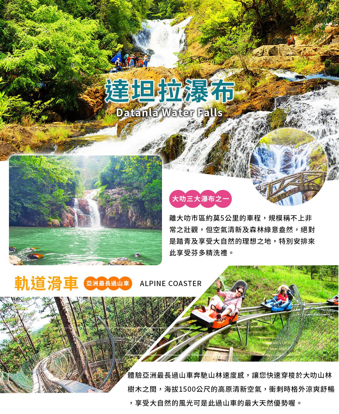 距市區約十公里,大叻的週邊擁有著數個瀑布之一,再加上裡頭 附設步道、雲霄飛車等設施,使得他深受國外遊客喜愛。