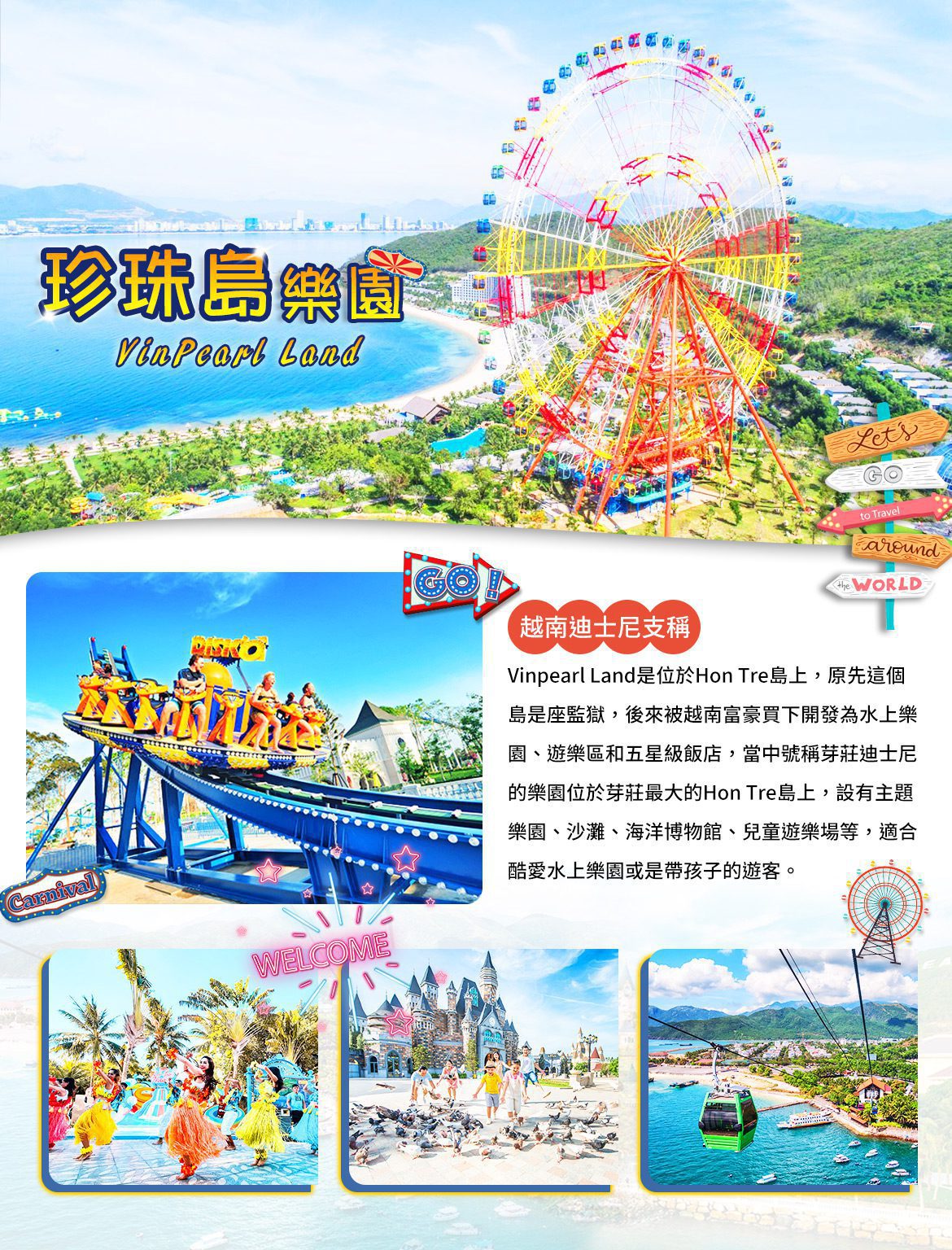 珍珠島水陸樂園渡假村(含樂園一票到底門票)越南最大的遊樂園,有東南亞迪士尼美稱精彩的樂園設施有: 過山車、自由落體、高山斜軌車、搖頭飛椅、大擺錘、礦山車等,摩天輪是樂園的新亮點(高200公尺),也是園區最新開放的熱區等活動精彩刺激,不限次數任君選擇。高山斜軌車是網紅推薦項目,一邊體驗刺激破表的速度,一邊欣賞芽莊灣美景喔!