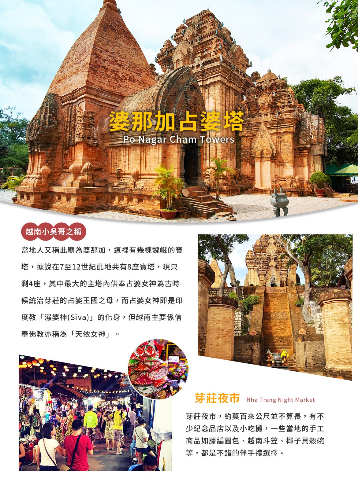 芽莊市區週邊有不少小昂景點,一定要到婆那加占婆塔又稱為越南小吳哥窟建於西元7-12世紀這座寺廟是用來供奉占婆的,她是越南的女神保護著靠海吃飯的漁民,相當於台灣漁民心目中的媽祖占婆族是從印度移居越南的早期定居者,芽莊婆那加占婆塔是印度教建築,其建築風格受到前吳哥時期高棉文化的深遠影響,可能是現存的歷史最悠久的占城佛塔。四方的塔身,錐形塔頂,外牆雖有些損壞,但卻無衰敗之像,得到了精心的維護。婆那加塔外的空地上,常有越南人表演占族歌舞。如今,婆那加塔已成為芽莊的著名景點。
