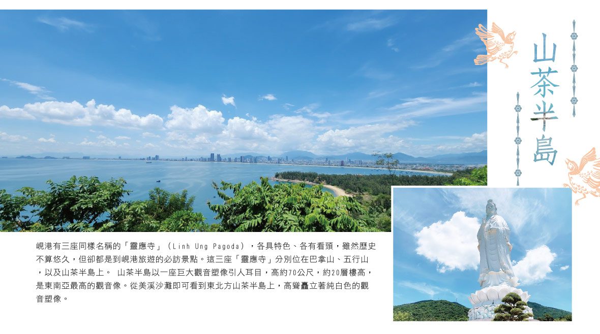 峴港有三座同樣名稱的「靈應寺」(Linh Ung Pagoda),各具特色、各有看頭,雖然歷史不算悠久,但卻都是到峴港旅遊的必訪景點。這三座「靈應寺」分別位在巴拿山、五行山,以及山茶半島上。 山茶半島以一座巨大觀音塑像引人耳目,高約70公尺,約20層樓高,是東南亞最高的觀音像。從美溪沙灘即可看到東北方山茶半島上,高聳矗立著純白色的觀音塑像。觀音塑像高踞於蓮花座上,內部分為17層樓,每一個樓層都有21尊佛雕,姿勢表情各異,展現精緻的工藝之美。 靈應寺廟宇腹地寬廣,院內種有各種花草、盆景,四季花開不斷。寺廟的正殿中間供奉釋迦牟尼佛像,通往正殿的路兩旁是排列整齊的18尊羅漢佛像,均由白玉雕刻而成,佛像表情神態逼真,栩栩如生,呈現喜怒哀樂不同樣態的神情。