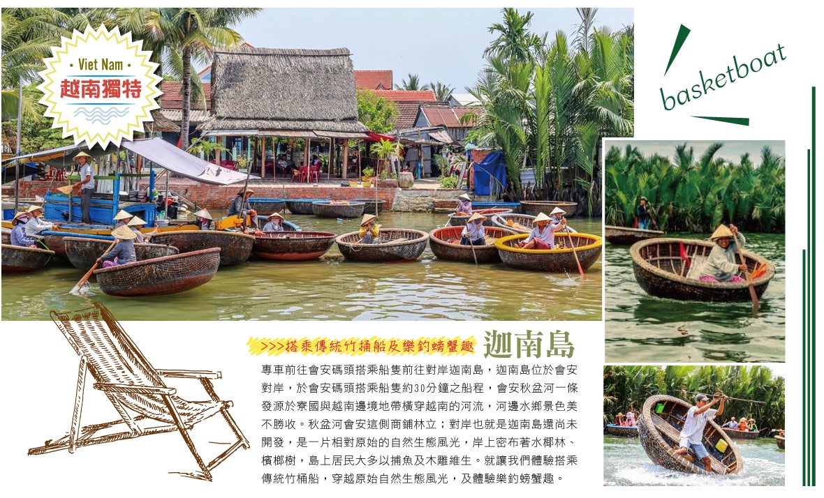 會安 → 遊迦南島(乘越南簸箕船+釣螃蟹體驗) → 會安古鎮(世界文化遺產–進記古宅、日本橋、福建會館、廣肇會館、夜遊古鎮)