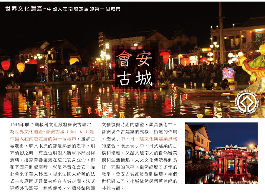 1999年聯合國教科文組織將會安古城定爲世界文化遺産 會安古城(Hoi An)是中國人在南越定居的第一個城市,漫步古城老 街,映入眼簾的都是熟悉的漢字。明末清初之時,有五位明朝大將軍不願投降清朝,攜家帶眷渡海在這兒安身立命。鄭和下 西洋到越南時,就是停留在會安,從此帶來了華人移民。 要感受會安古城濃厚的中國氣息,要到Lei Loi及Tran Phu兩大老 街,兩旁盡是已屹立了數百年的古老中式建築,建築由山牆、彩色鴛鴦瓦蓋頂、硬木做成的柱椽、門扇、紅牆綠瓦組成深宅 大院,無論是屋子的結構、佈置及傢俱,都極富中國氣息。 後來法國人新蓋的法式古典庭園式建築夾雜在古城之間,依著秋 盤河而建,悠閒又浪漫。法式建築外形漂亮、線條優美,外牆裝飾歐洲文藝復興時期的雕塑,頗具藝術性。 會安現今古建築 的式樣、街道的佈局,體現了中、日、越文化與建築風格的結合。既展現了中、日式建築的古樸和優雅,又融入越南人的自 然審美觀和生活情趣,人文文化傳統得到良好、完整的保存。雖然經歷了多年的戰爭,會安古城卻沒受到破壞。幾個世紀過 去了,小城依然保留著曾經的樸拙古韻。