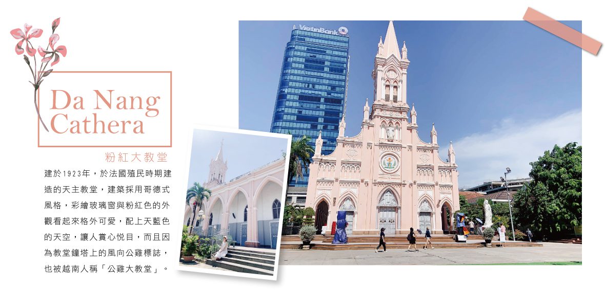 粉紅色外牆的峴港大教堂,建築風格是浪漫的哥德式,充滿可愛、夢幻感,很容易讓人少女心大噴發,也因此成了許多遊客拍照打卡的熱門景點。 教堂外觀看起來十分新穎,但其實已有90多年的歷史,建於法國殖民時期1923年,因教堂尖塔上有一個具代表性的公雞風向標,因此又稱作「公雞教堂」。 教堂內部只有在彌撒時間才會對外開放,如要入內參觀,最好先查好時間再前往。若安排不到時間,在教堂外散步,欣賞教堂外觀、拍拍照也是很滿足了。 教堂後方設有祭壇,在這裡也可看到信徒向聖母像祈禱。比較特別的是,現場設有香爐,有看到信徒拿香朝著聖母像拜拜,算是相當特別的中西信仰文化的融合。