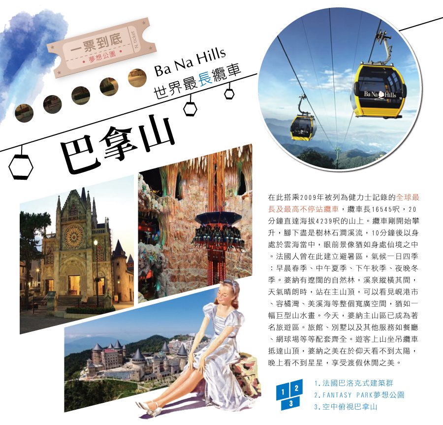 峴港 → 巴拿山(纜車來回) → 靜心園(小火車)→ 佛手天空步道 → FANTASY PARK 夢想公園