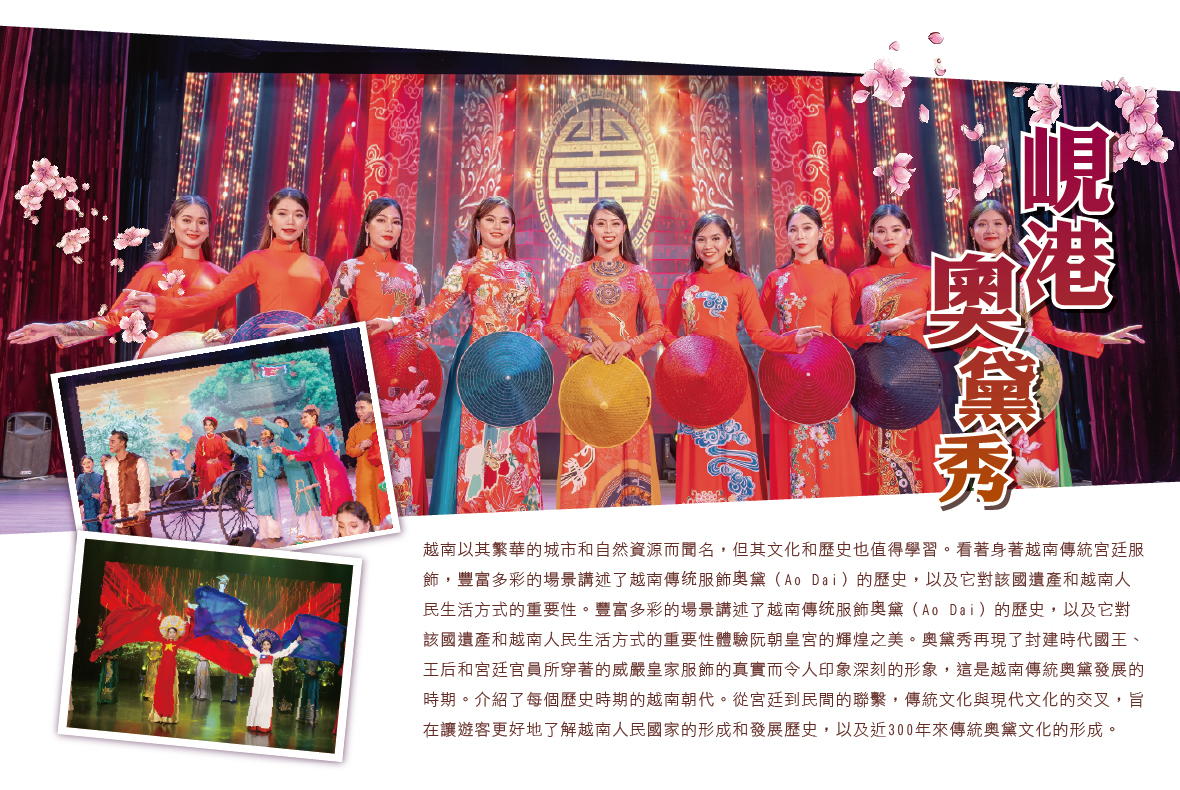 越南以其繁華的城市和自然資源而聞名,但其文化和歷史也值得學習。看著身著越南傳統宮廷服飾,豐富多彩的場景講述了越南傳统服飾奥黛(Ao Dai)的歷史,以及它對該國遺產和越南人民生活方式的重要性。豐富多彩的場景講述了越南傳统服飾奥黛(Ao Dai)的歷史,以及它對該國遺產和越南人民生活方式的重要性體驗阮朝皇宮的輝煌之美。奧黛秀再現了封建時代國王、王后和宮廷官員所穿著的威嚴皇家服飾的真實而令人印象深刻的形象,這是越南傳統奧黛發展的時期。介紹了每個歷史時期的越南朝代。從宮廷到民間的聯繫,傳統文化與現代文化的交叉,旨在讓遊客更好地了解越南人民國家的形成和發展歷史,以及近300年來傳統奧黛文化的形成。