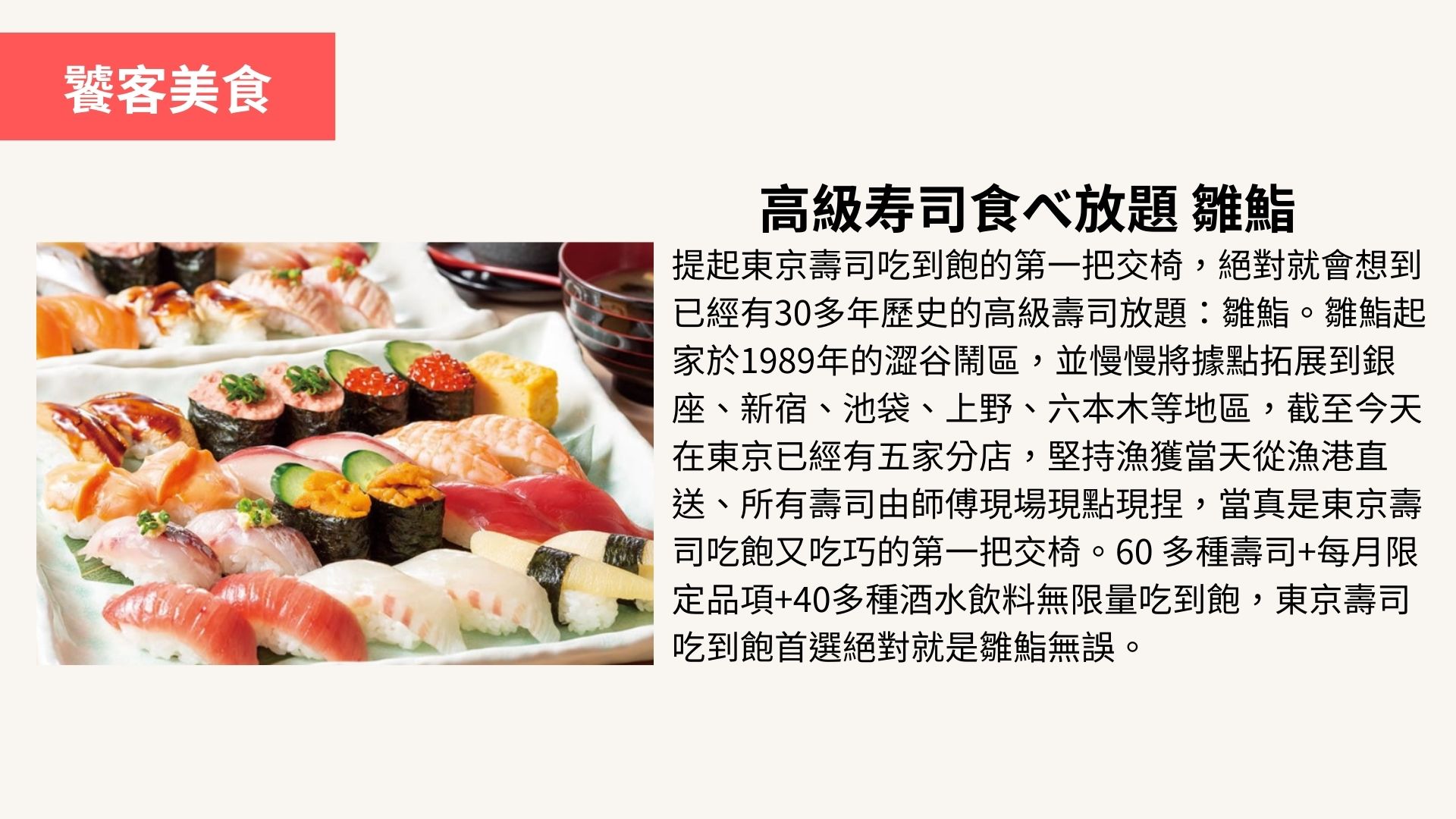 晚餐:高級寿司食べ放題 雛鮨