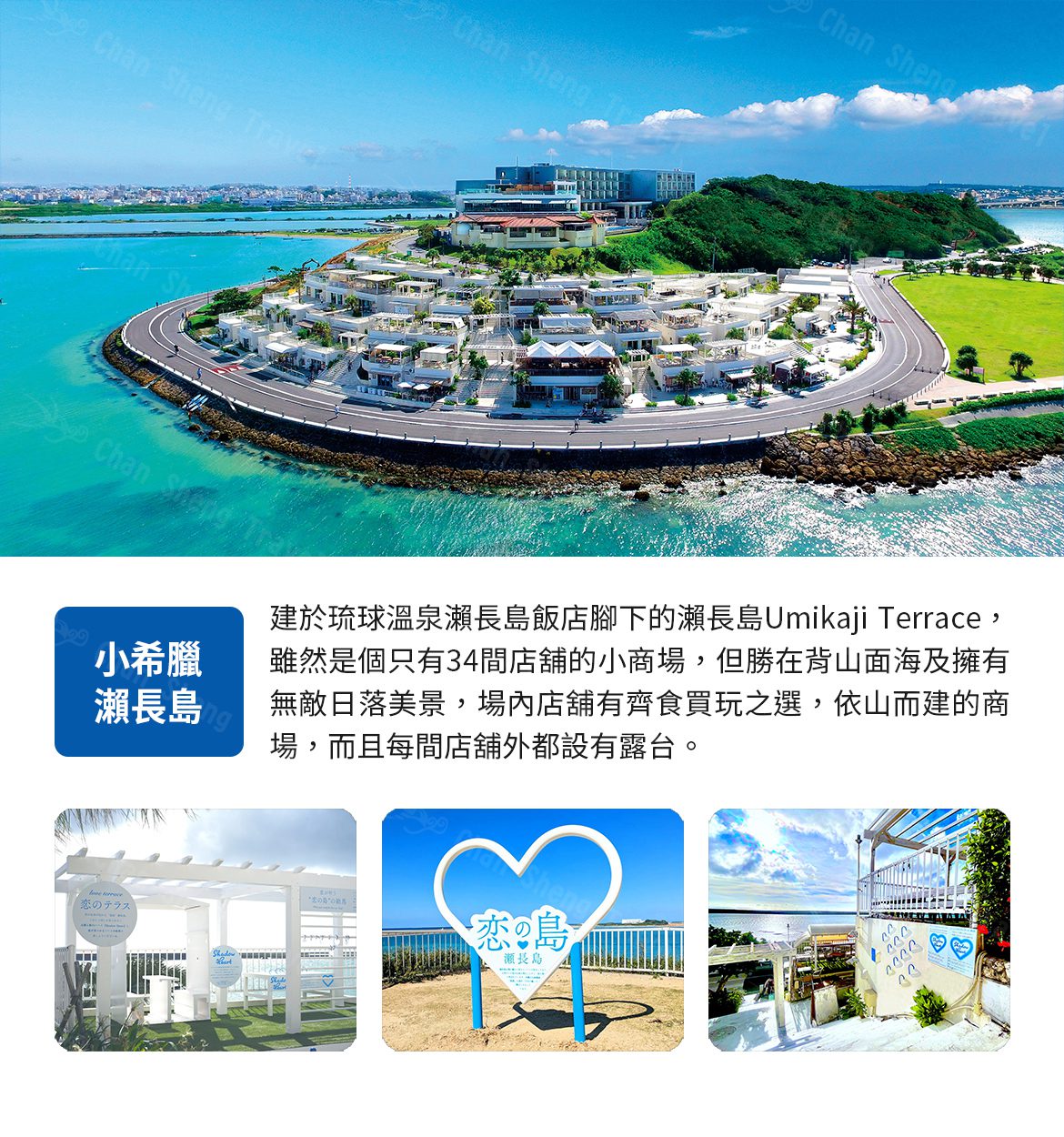位於那霸機場南方約1.5公里處,從機場自駕開車,經過跨海大橋,只要10~20分鐘就可以抵達,繞島一圈也只要2、3分鐘,景點之間距離很近,只用雙腳移動也很輕鬆,非常適合在此安排個半日遊!自從瀨長島上開設「琉球溫泉瀨長島飯店」後,這裡逐漸成為觀光地,2015年更因白色的露天商場「瀬長島 Umikaji Terrace」開幕,被冠上沖繩地中海、小希臘的美名,成為拍照打卡聖地。