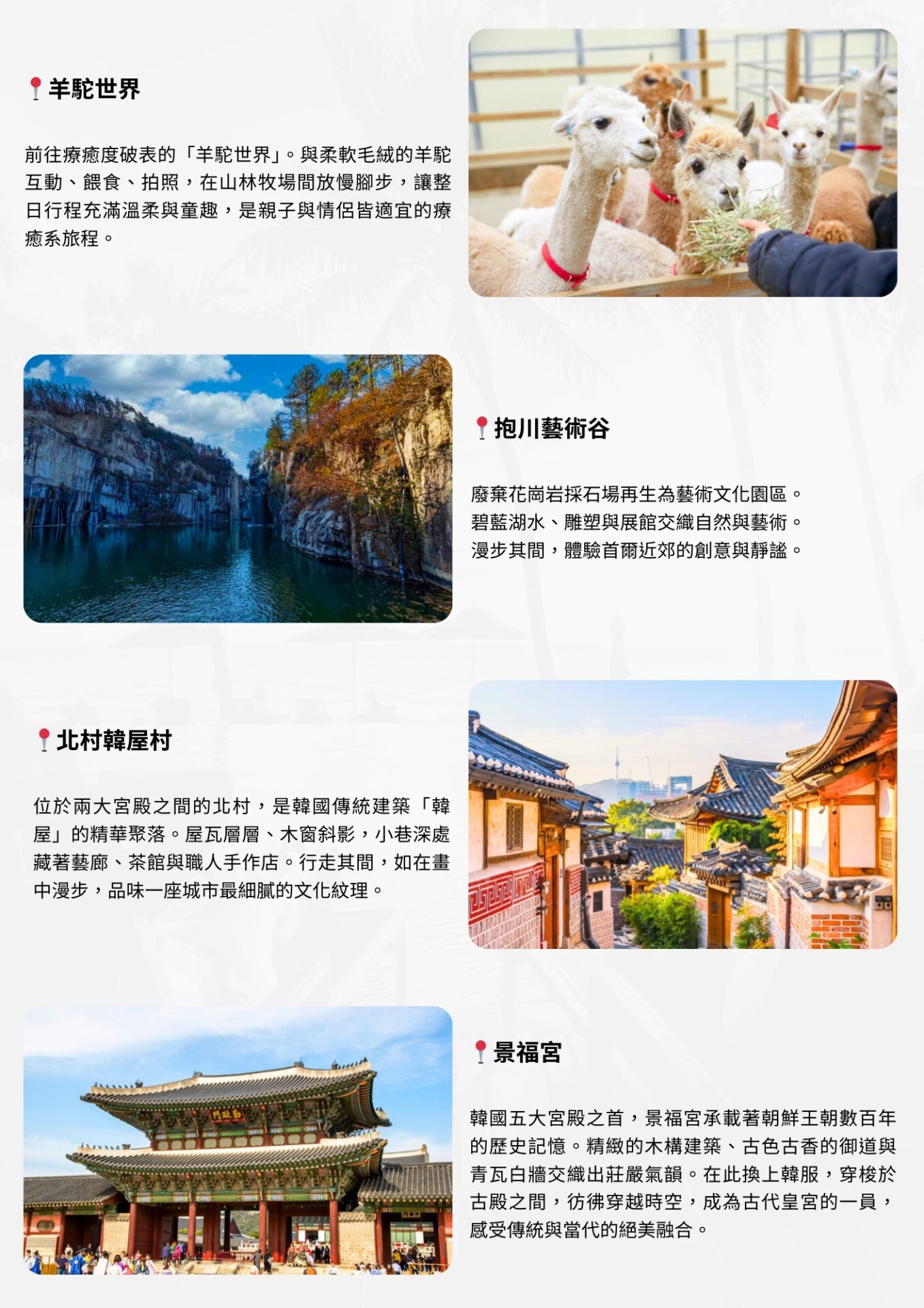 除了經典的南怡島,這一日特別安排前往療癒度破表的「羊駝世界」。與柔軟毛絨的羊駝互動、餵食、拍照,在山林牧場間放慢腳步。搭配南怡島的自然森林,讓整日行程充滿溫柔與童趣,是親子與情侶皆適宜的療癒系旅程。