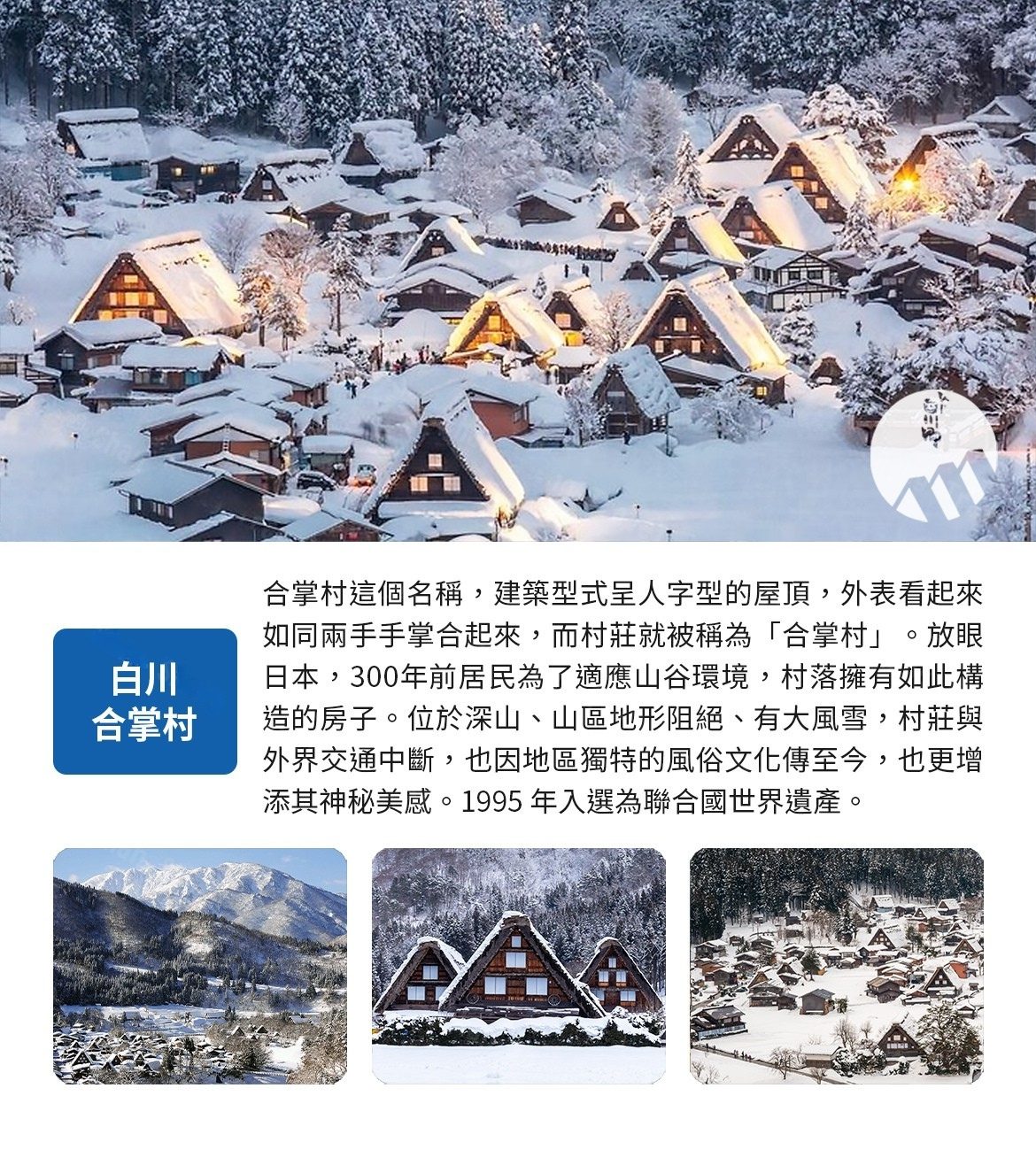 世界遺跡之處,將兩個建材合併成叉手三角形狀屋頂,稱為「合掌」,可減少受風力,且調節日照量,使屋內得以冬暖夏涼。因在深山之故,從古以來居民被大自然之天氣變化考驗而集智慧之結晶以稻草蘆葦合掌形之屋頂建築住屋來維持嚴東下雪天數多之安全。因整個村莊都同樣之建築模型,幾百年均沒改變完整保留下來,今人特別感到不同社會之情景。