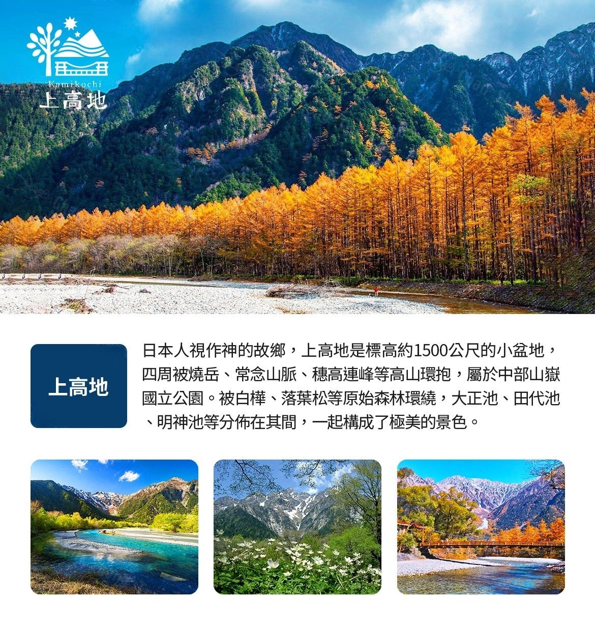 位於長野縣西部的梓川上游,被穗高連峰、燒岳、常念山脈等環抱著,是標高約1500米的小盆地,屬於中部山嶽國立公園。經19世紀英國傳教士、登山家沃思特·威斯頓的介紹而被世界所知,作日本著名的風景勝地也被多的登山家所知曉。這一帶被白樺、落葉松等的原始森林環繞,大正池、田代池、明神池等分佈在其間,與高聳的各山群的雄姿一起構成了極美的景色。