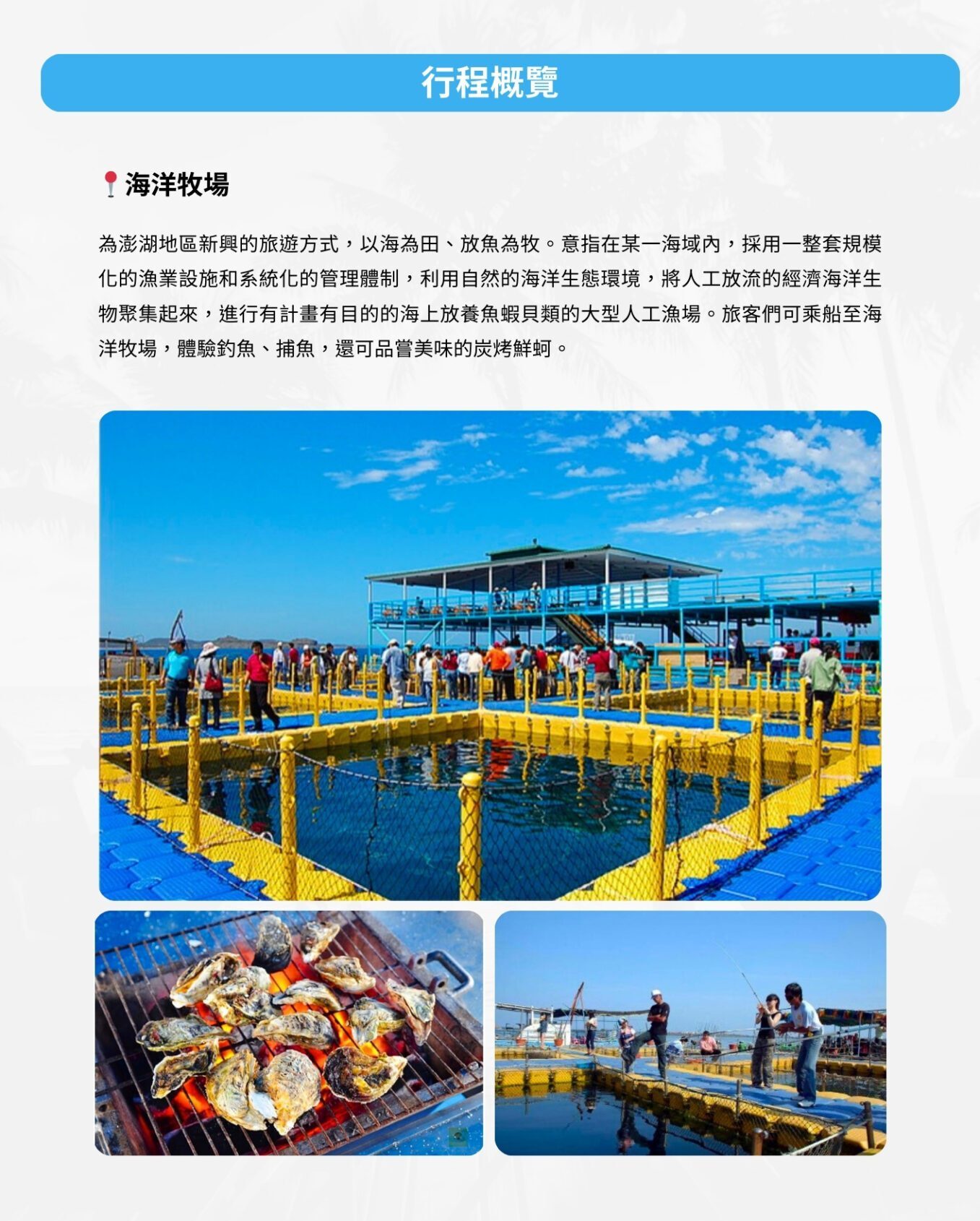 為澎湖地區新興的旅遊方式,以海為田、放魚為牧。意指在某一海域內,採用一整套規模化的漁業設施和系統化的管理體制,利用自然的海洋生態環境,將人工放流的經濟海洋生物聚集起來,進行有計畫有目的的海上放養魚蝦貝類的大型人工漁場。旅客們可乘船至海洋牧場,體驗釣魚、捕魚,還可品嘗美味的炭烤鮮蚵。