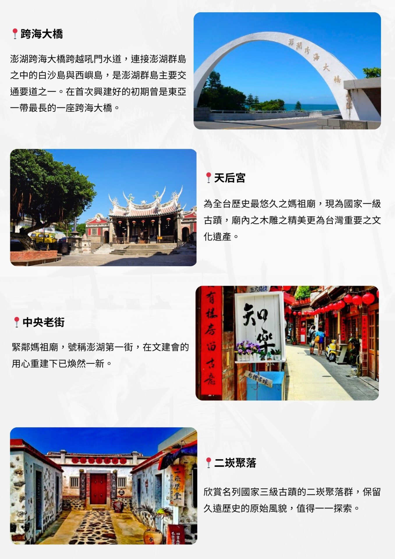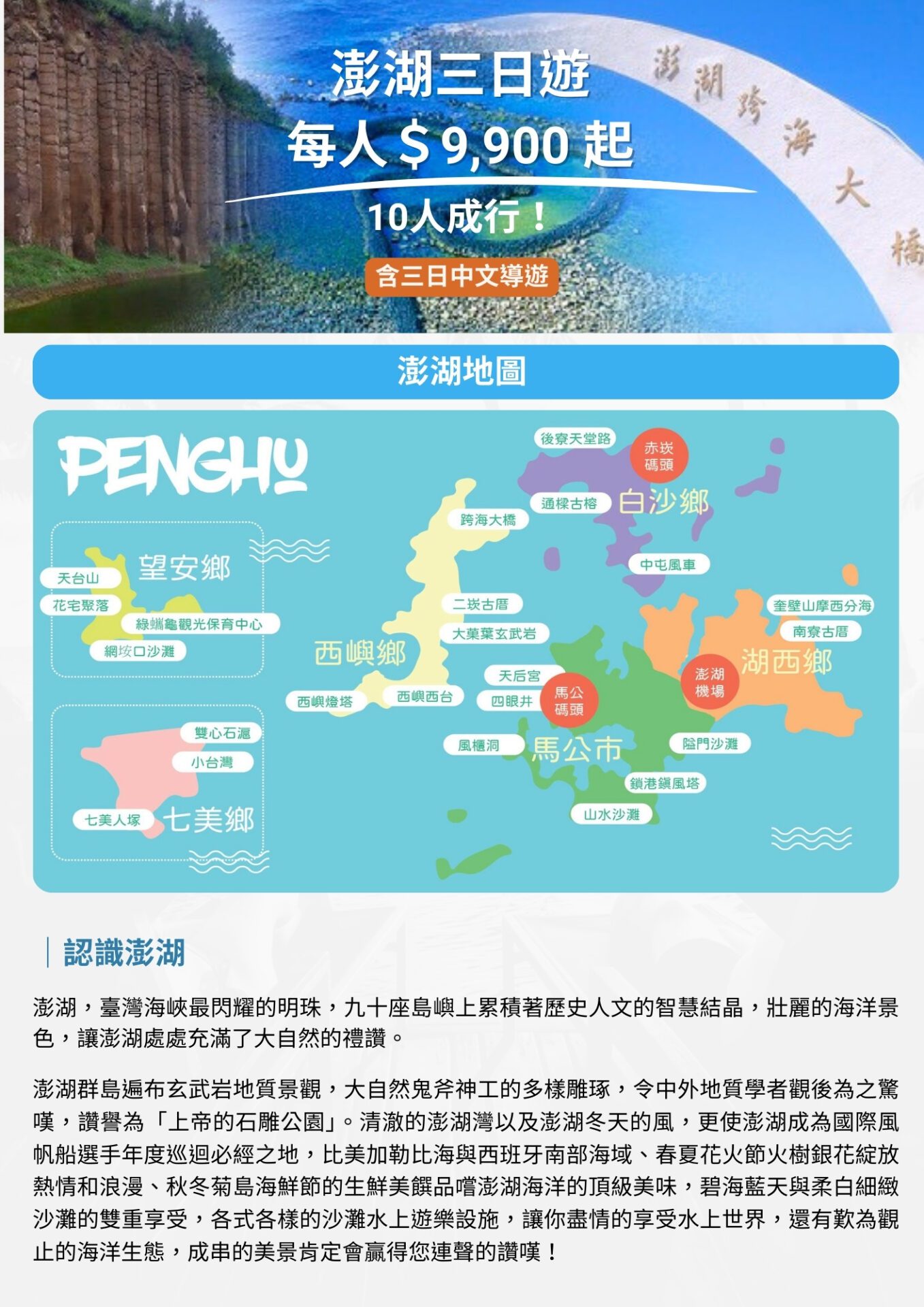 - 台北-澎湖來回機票 *若改嘉義布袋搭船成人減NT$ 3,300/人。