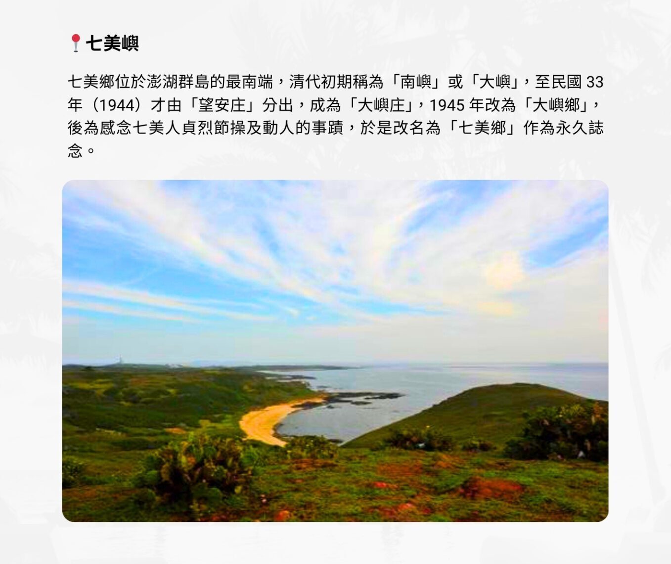 七美鄉位於澎湖群島的最南端,清代初期稱為「南嶼」或「大嶼」,至民國 33 年(1944)才由「望安庄」分出,成為「大嶼庄」,1945 年改為「大嶼鄉」,後為感念七美人貞烈節操及動人的事蹟,於是改名為「七美鄉」作為永久誌念。